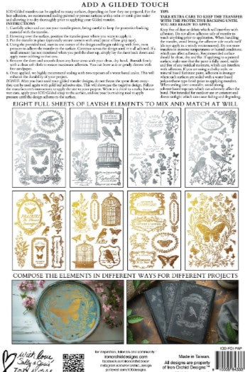 Papillon layers beautifully across a range of surfaces and can be used to create striking focal points or subtle gilded accents. The birdcages pair especially well with floral collections like Madeleine, allowing for elegant, mixed-style compositions. Whether applied to books, trays, décor pieces, or mixed-media artwork, this transfer adds a refined metallic touch that complements both vintage and modern projects.